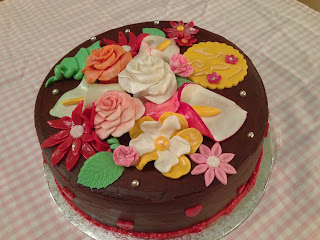 El otro día era el santo de Claudia una amiga y compañera de waterpolo de mis ahijados y su mamá le quiso dar una sorpresa, le regalo una tarta de chocolate adornada con muuuuuchas flores y ahí os la pongo, el bizcocho que hice es la receta de Chocolate Layer Cake, con relleno y cubierta de ganache de chocolate, las flores las hice de pasta de goma que compre on line en la tienda de Maria Lunarillos, es una tienda fantástica en la que encontraras todo lo que necesites para repostería, a mi me encanta..